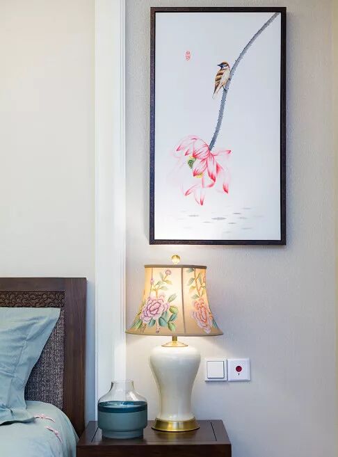 象征美好纯洁的荷花挂在床头两侧,贯穿整个新中式空间的纯美,点缀着整个空间的中式文化气息。