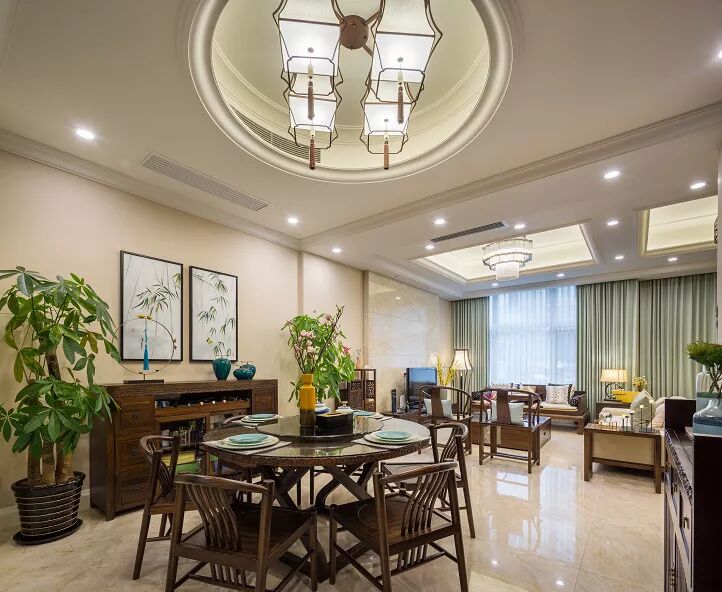 餐厅与客厅一体化的设计足够的展示了空间两用的设计原理,中式注重团圆,所以在餐桌的选取上使用了圆桌子。