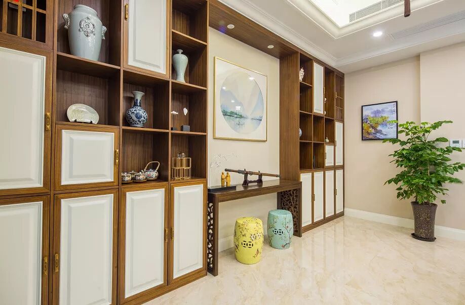 经过叶子之手,没想到新中式还能如此温柔,薄荷绿的窗帘让整个空间变得温馨又有色彩,清新纯白色柔和了温润木质的特色,展现出简约纯粹的生活质感,摆放着业主收藏的各种中式玩件。体现业主的对传统文化的喜爱。