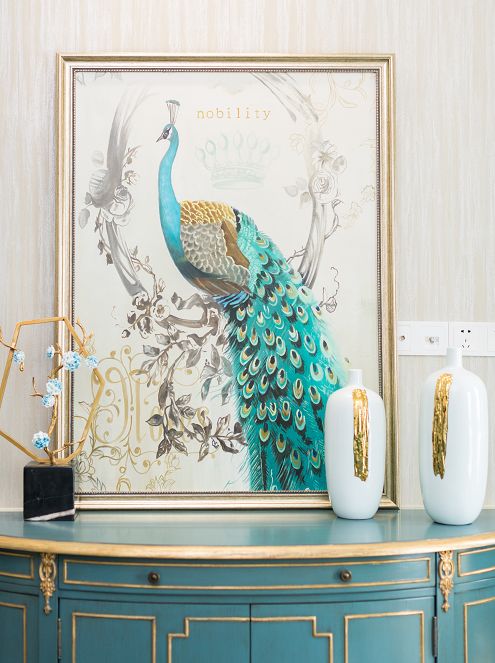 精致的摆柜上立着一副精致的孔雀图,配上两个温润如玉的花瓶,寓意着富贵吉祥。