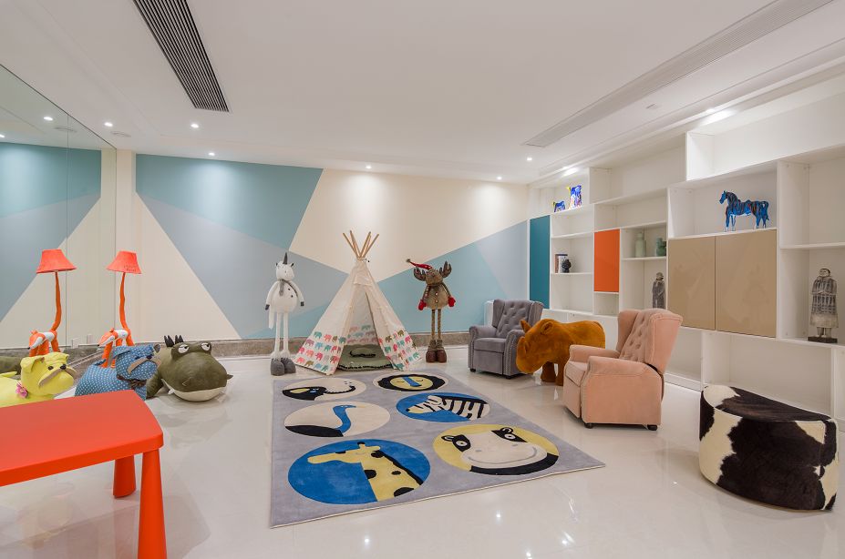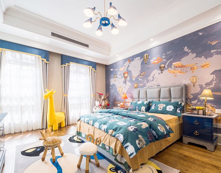 叶子老师将自己对孩子的爱用在了每一个家庭的儿童房,依旧是大胆的配色,蓝色的吊灯以及蓝色的背景墙,代表着蓝色的天空,希望孩子以后可以自由的翱翔在自己的世界。童玩的世界里少不了动物,床品以及座椅都是动物造型打造,希望宝宝们在自己世界里快乐的成长。