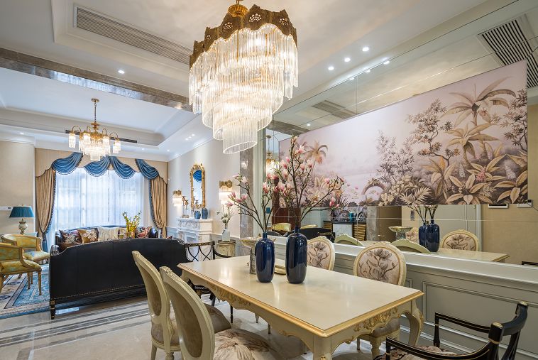 餐厅里法式轮廓的餐桌以及餐椅让整个空间温柔又浪漫,琉璃灯的光束打在食物上,让用餐变成一种享受,两个琉璃花瓶配上几支简单的花束也让用餐更有食欲。